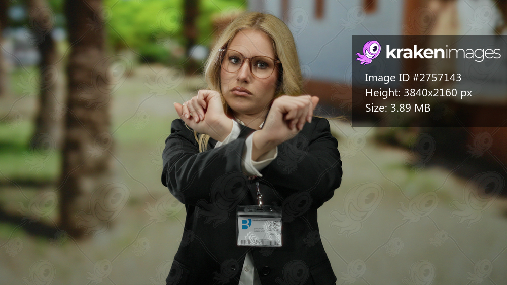 Woman in business suit with glasses stands in stone courtyard showing stop gesture with closed eyes, blonde hair, id badge, conveying disapproval in mediterranean background. - Kraken Images