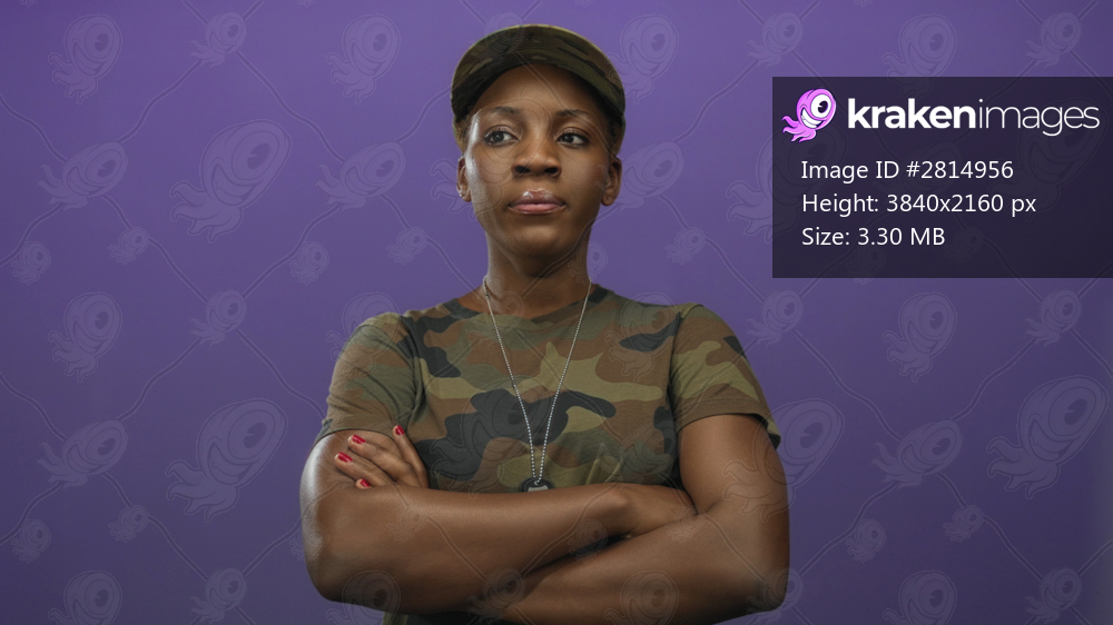 Woman in camouflage uniform crosses arms showing military dog tags in studio and gazes ahead with a stoic expression; pride.