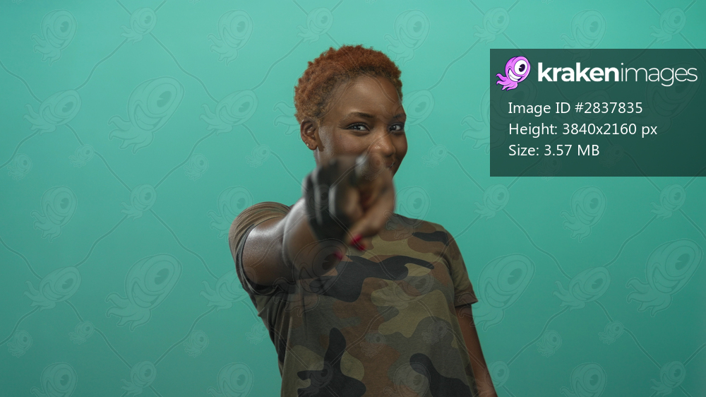 Woman in camouflage uniform points finger towards camera in studio; recruitment motivation confidence empowerment.