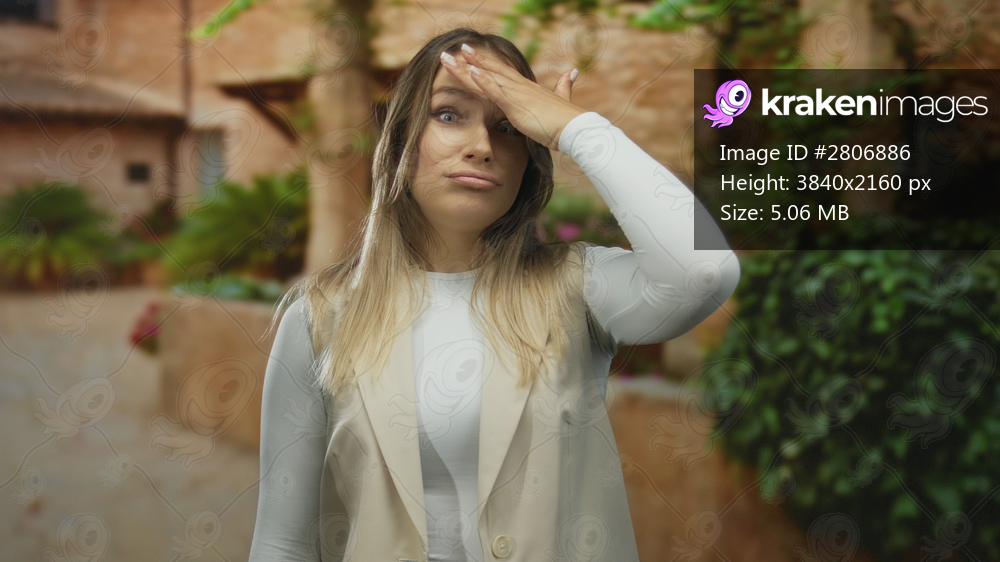 Woman in casual attire appearing thoughtful while standing on a quaint city street with an expression of contemplation during daytime.