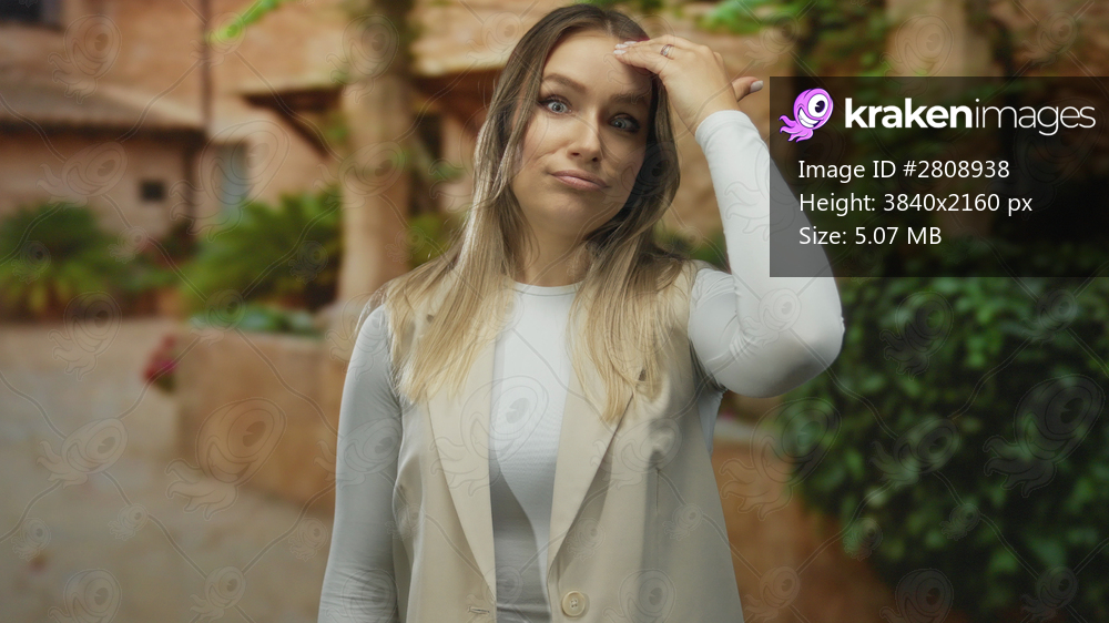 Woman in casual attire appearing thoughtful while standing on a quaint city street with an expression of contemplation during daytime.