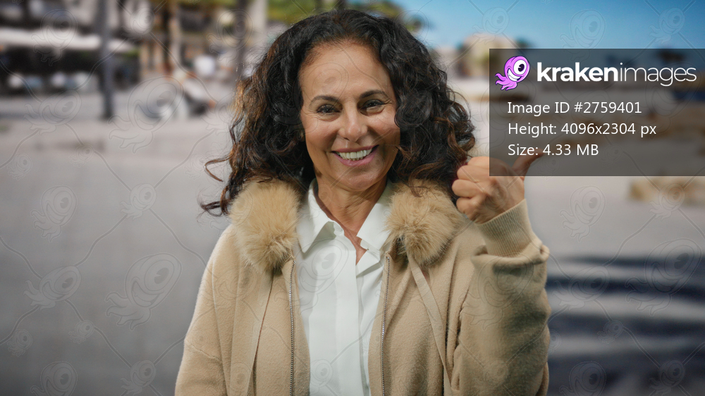Woman in casual coat with curly hair smiles while giving thumbs up at a seaside, capturing a beautiful, mature, hispanic presence outdoors on the sunny beach. - Kraken Images