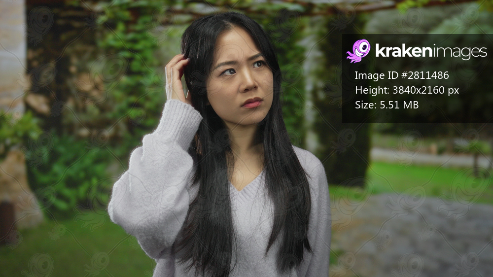Woman in casual sweater standing thoughtfully in lush green park surrounded by serene outdoor scenery on a cloudy day.
