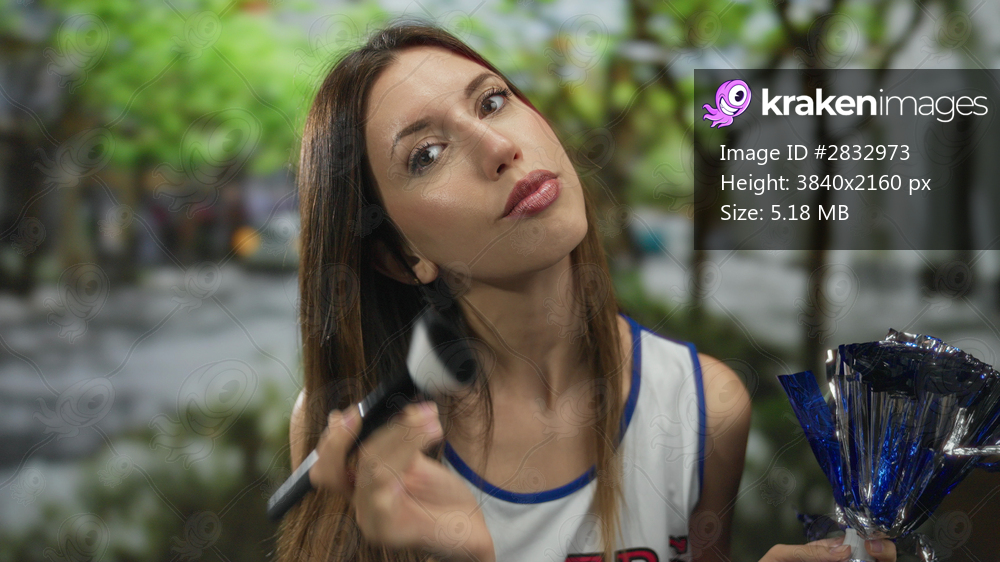 Woman in cheer uniform applies brush to cheek while holding metallic blue pompom on urban street at dusk; confidence spirit.