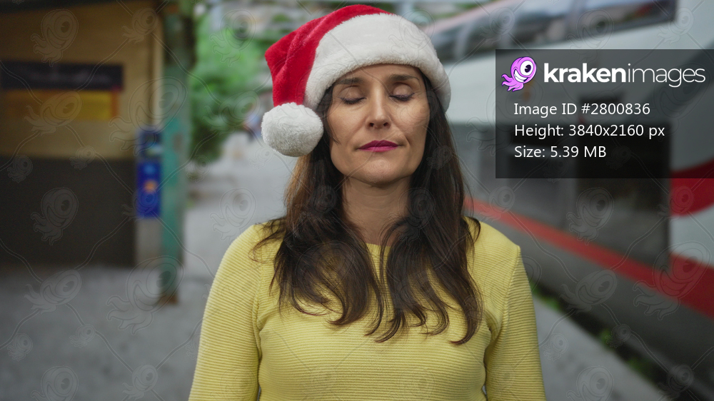 Woman in christmas hat gazes up at a train station, wearing yellow sweater, suggesting holiday travel at a railway outdoors with a festive, anticipatory mood. - Kraken Images