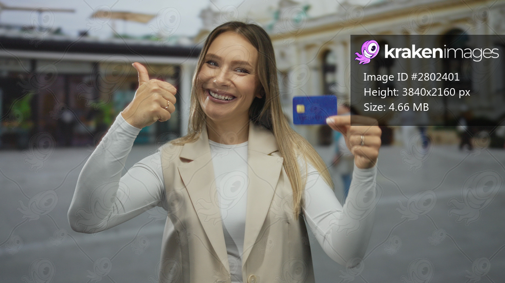 Woman in city holding credit card with thumbs up, expressing success and happiness, while standing outdoors in a lively urban street environment.