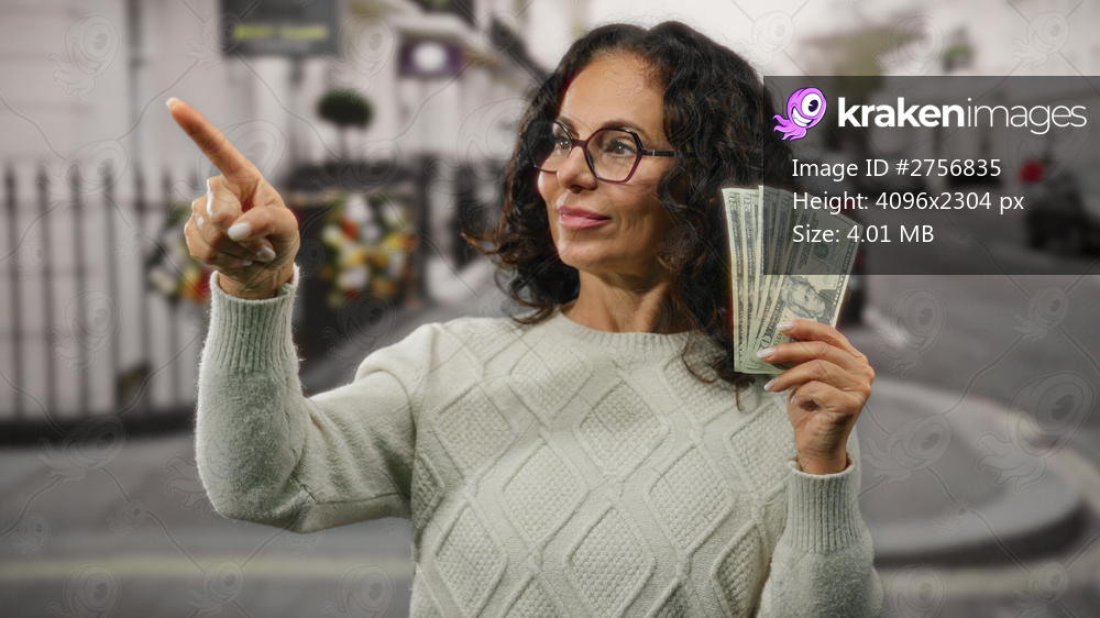 Woman in city street holds american dollars, pointing confidently, wearing glasses and white sweater, embodying success and middle-aged charm in urban setting outdoors. - Kraken Images
