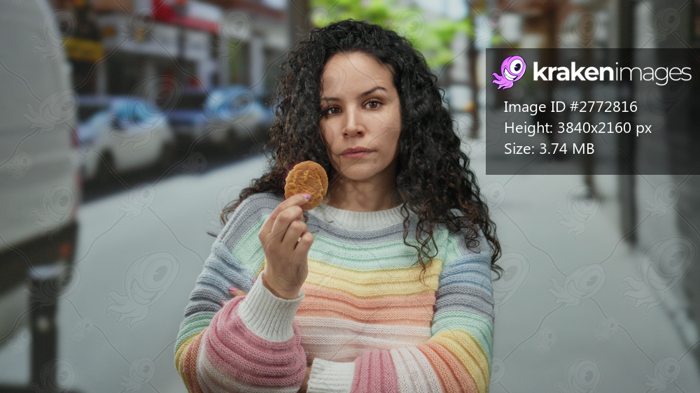 Woman in colorful sweater on street holding cookie outdoors examining expression cars blurred background urban young hispanic female outdoors casual setting.