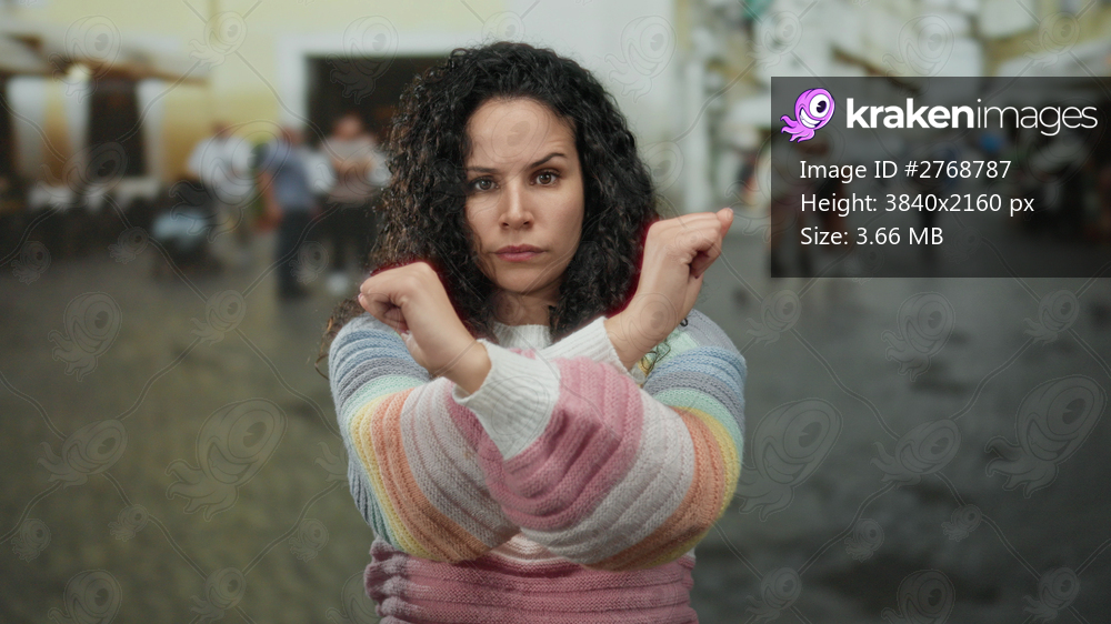 Woman in colorful sweater outdoors on street showing rejection with crossed arms and serious expression amid blurred urban background depicting disagreement - Kraken Images