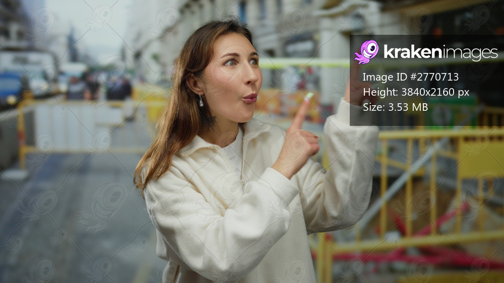 Woman in construction site points excitedly while wearing white hoodie, showcasing enthusiasm and curiosity in an urban environment, with colorful barriers in the background. - Kraken Images
