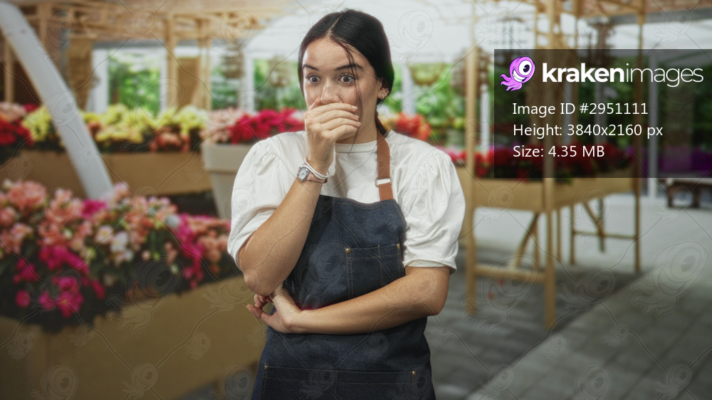Woman in denim apron covers mouth with hand, holding elbow, surrounded by potted flowers and wooden display tables inside a market building; quiet surprise.
