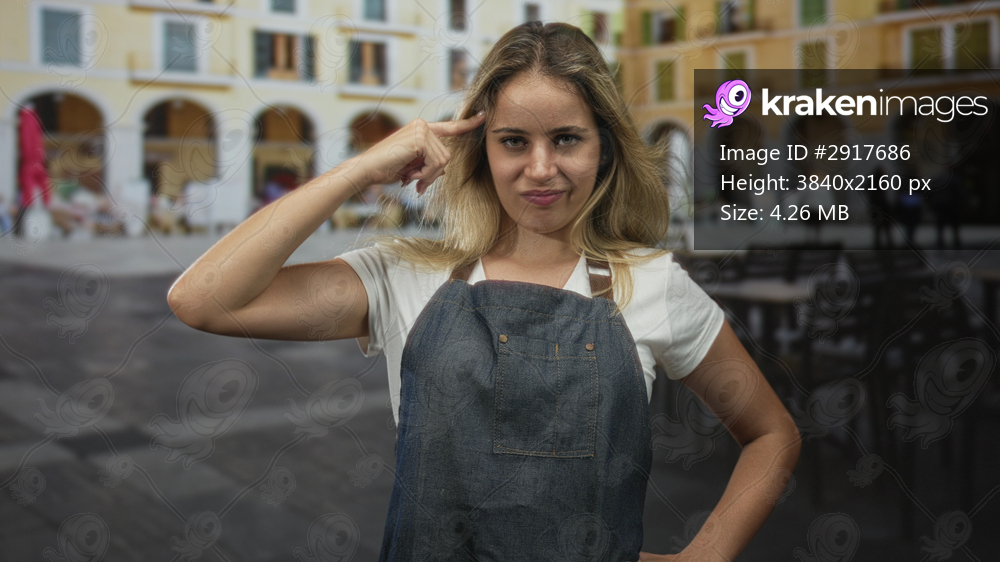 Woman in denim apron finger to temple in street plaza near outdoor cafe, pointing to head; thinking doubt.