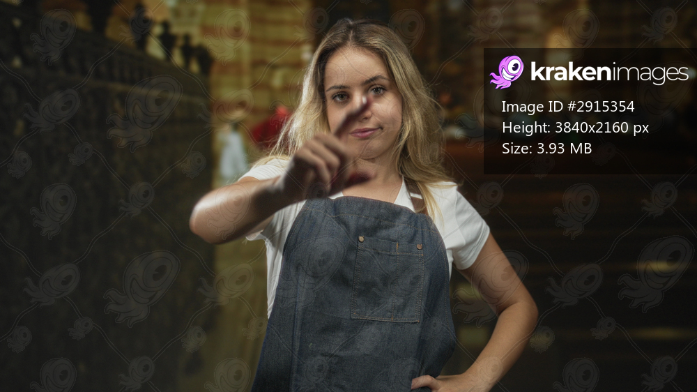 Woman in denim apron with hands on hips inside a church building, facing camera with a neutral, unimpressed expression; disapproval.
