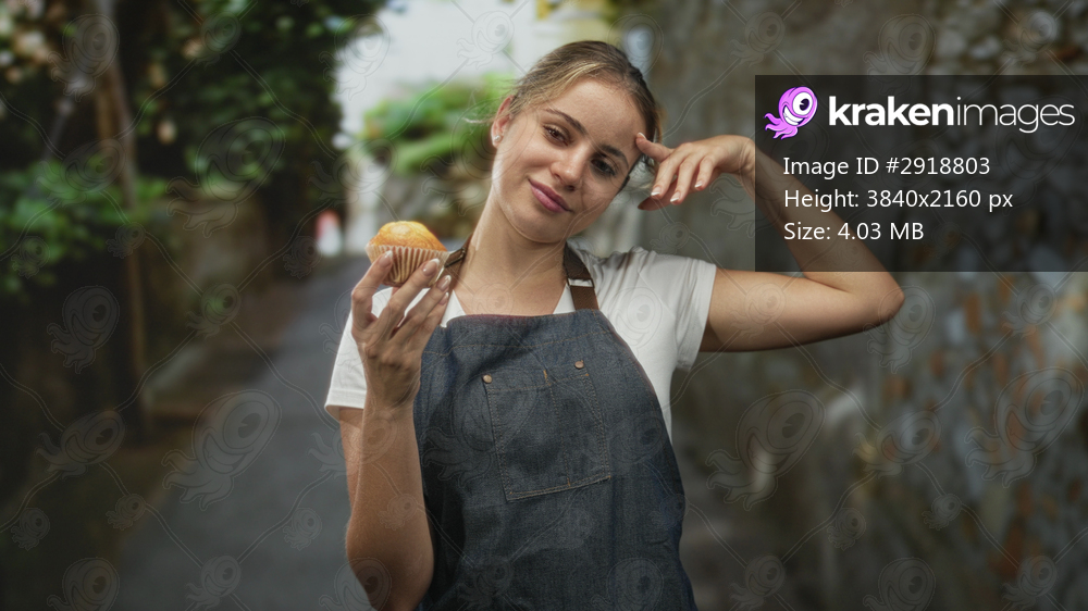 Woman in denim apron holding a muffin, hand to face wiping forehead on street beside stone wall and potted plants; quiet relief pause.