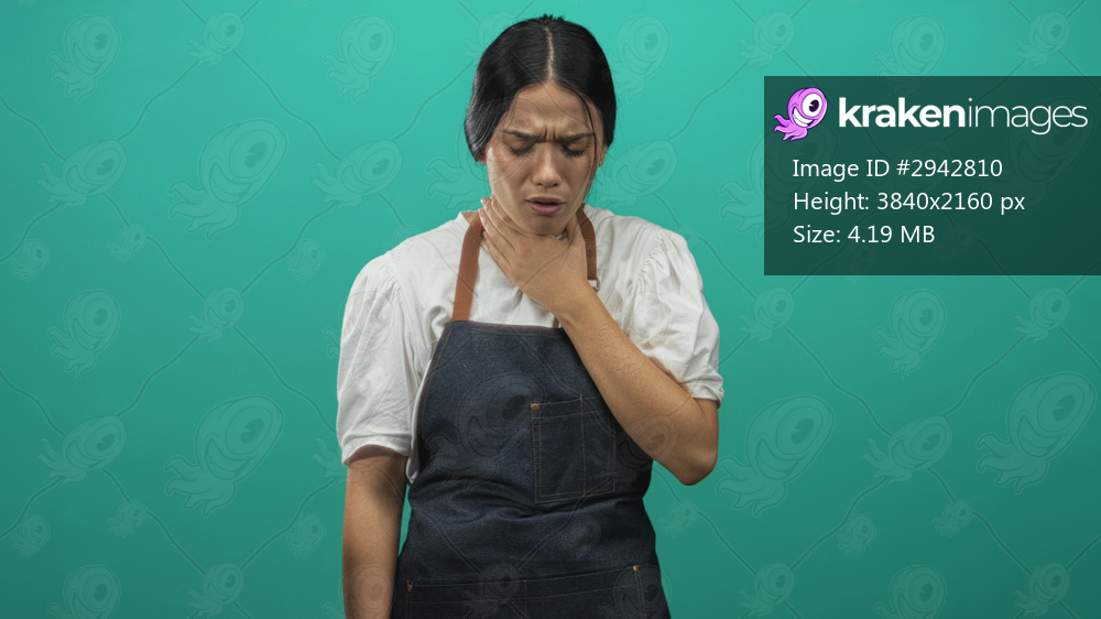 Woman in denim apron holding throat with hand, grimacing and showing discomfort against a teal studio backdrop; distress health.