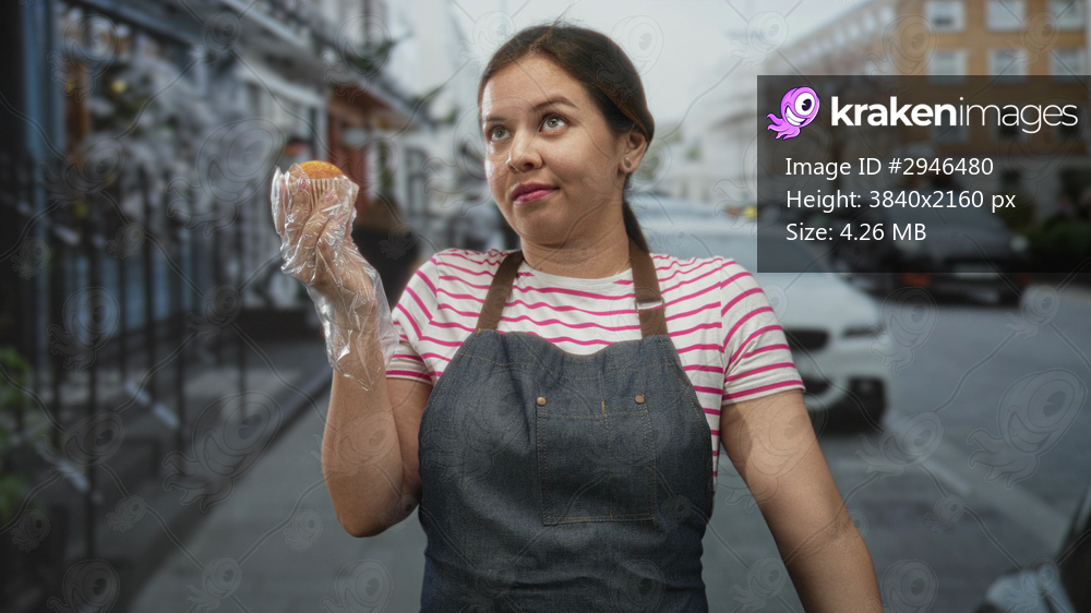 Woman in denim apron and pink striped shirt holding an orange with a gloved hand on a city street near parked cars and rowhouses; pride.