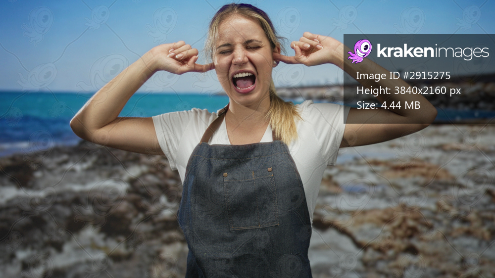 Woman in denim apron plugs ears with fingers in studio seaside scene near rocky coast pier, eyes closed and teeth clenched; frustration silence.
