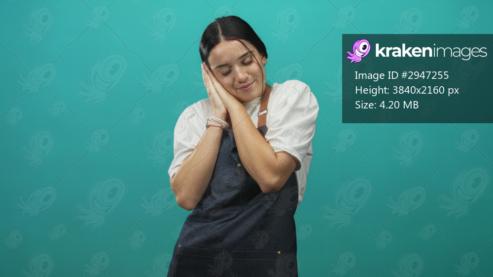 Woman in denim apron presses hands together at cheek in a studio, smiling with closed eyes; playful joy.