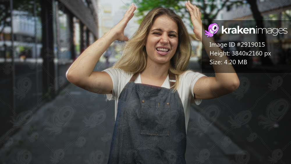 Woman in denim apron raising arms and grimacing on street while looking up with clenched hands; frustration release.