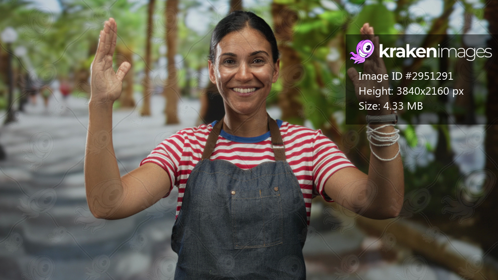 Woman in denim apron and red striped shirt smiles and raises both hands palms up while standing on a tree lined street with palms; joy.
