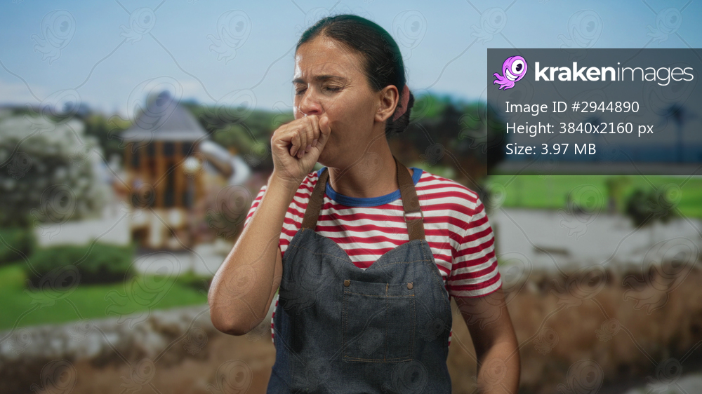 Woman in denim apron and red white striped shirt coughs into hand against a building facade by a park, holding a small whisk; illness concern.