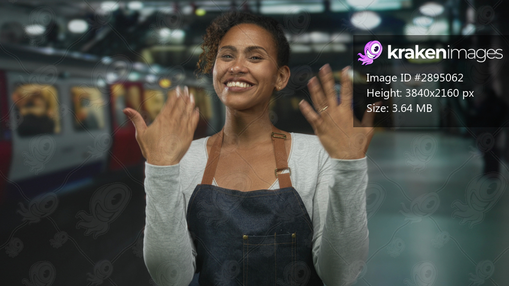 Woman in denim apron smiling and beckoning with open hands on a train station platform, facing camera inside the railway concourse; welcome.