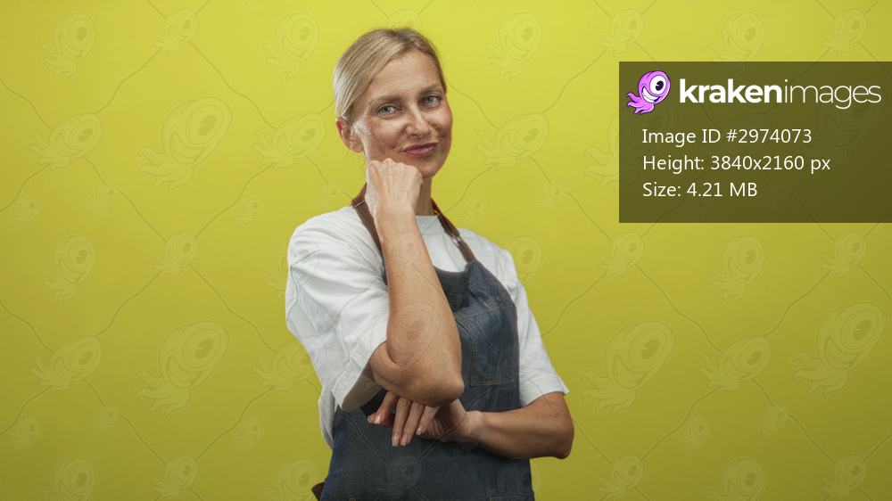 Woman in denim apron touching chin with finger while smiling in studio with yellow backdrop; thoughtful calm.