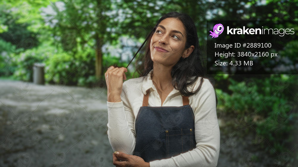 Woman in denim apron twirls hair with hand near face on a leafy park path while smiling; gentle contentment ease.