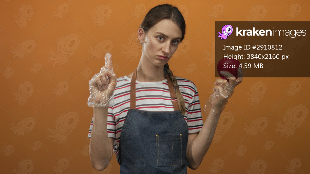 Woman in denim apron wearing plastic gloves holding red apple and pointing finger in studio; food safety doubt.