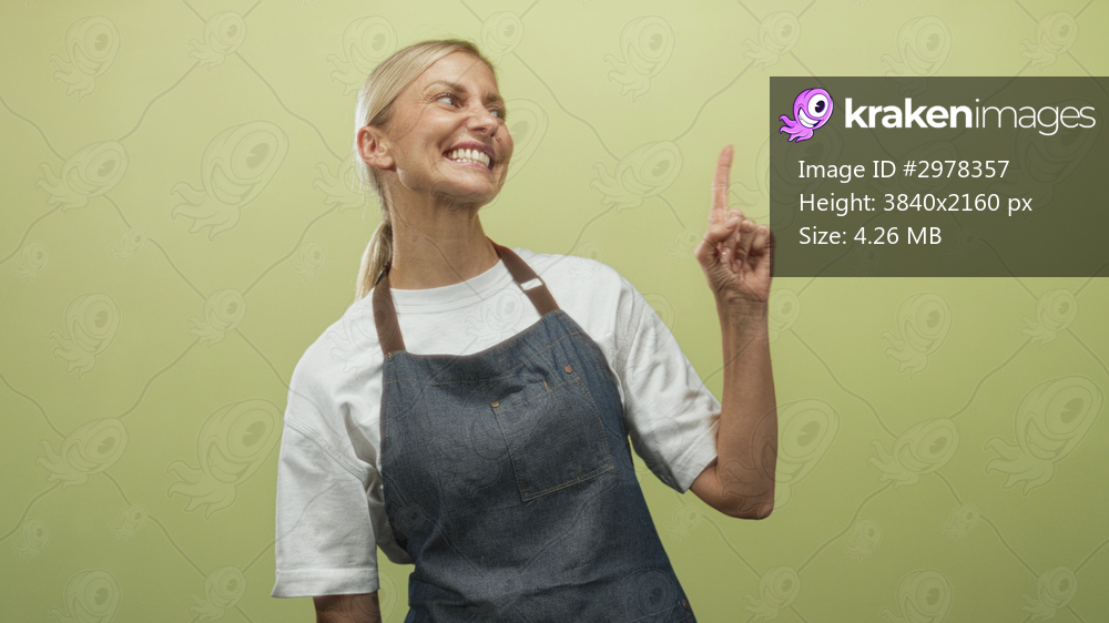 Woman in denim apron and white t shirt points index finger upward and smiles looking right in studio; cheerful confidence.