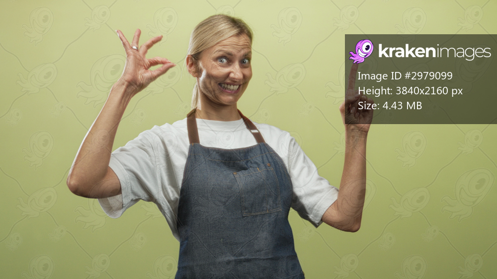 Woman in denim apron and white t shirt points index finger upward and smiles looking right in studio; cheerful confidence.
