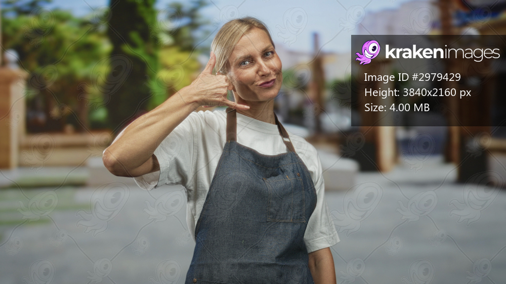 Woman in denim apron and white tshirt, blonde middleaged, makes a call gesture with hand near face on a street lined with columns and trees; friendly invitation. - Kraken Images