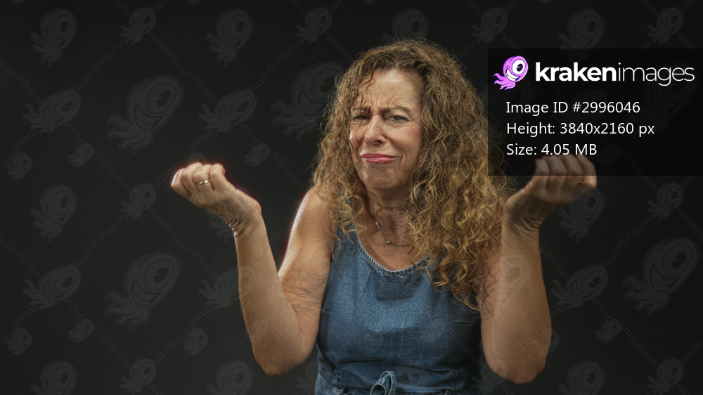 Woman in denim dress shrugs with hands raised and pulls face, sticking out tongue and tugging cheeks under studio lighting; confusion doubt.