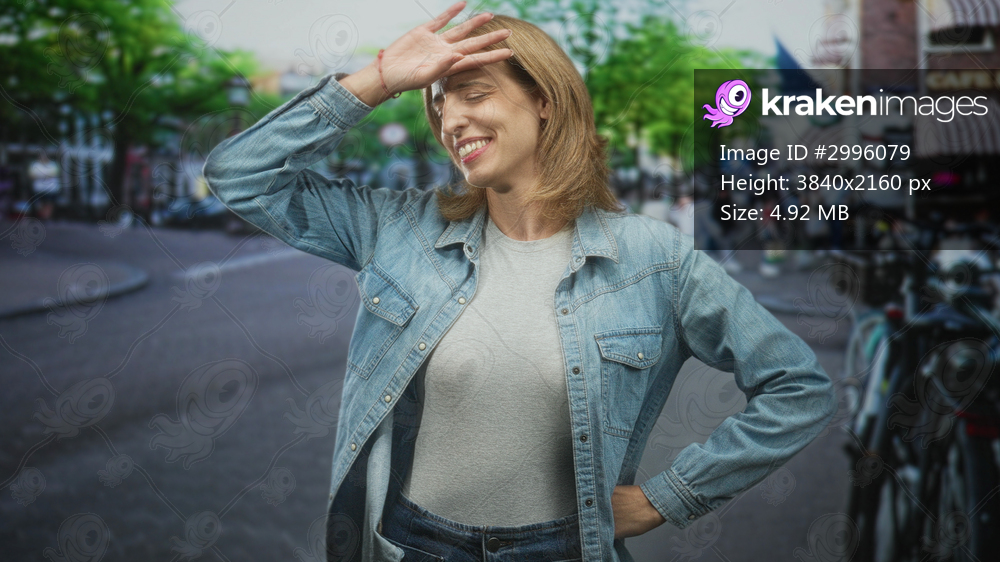 Woman in denim jacket posing hand on hip smiling with eyes closed on a busy street; confidence urban leisure.