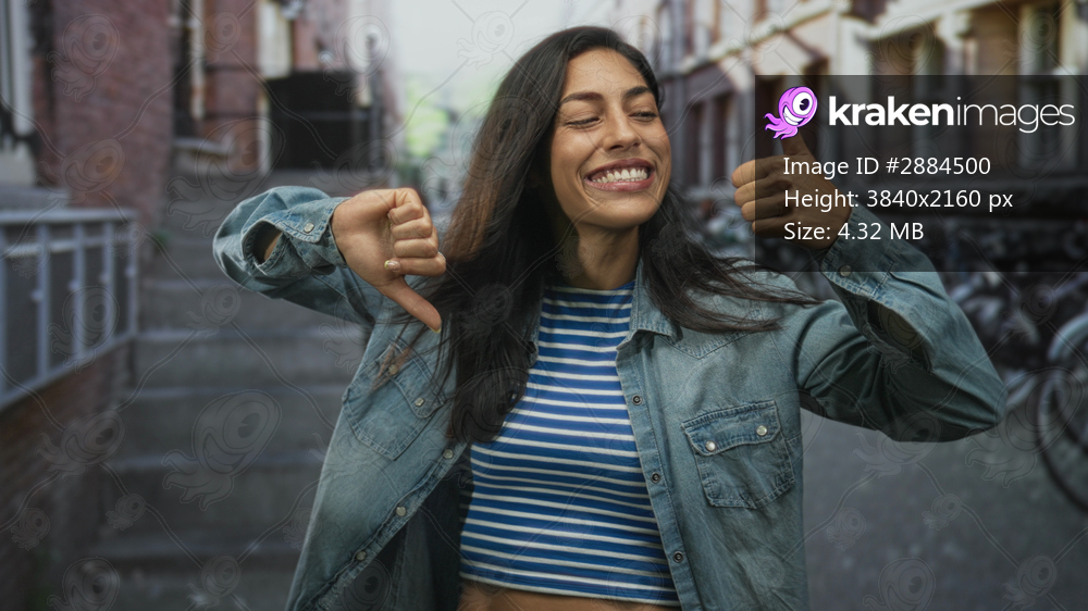 Woman in denim jacket and striped top showing thumbs up and thumbs down gestures on a street with brick buildings and bicycles; ambivalence.