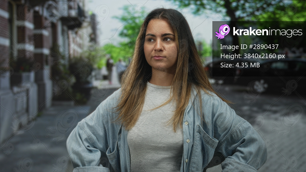 Woman in denim shirt standing with hands on hips on a city street near parked cars and trees, neutral expression; confidence independence.