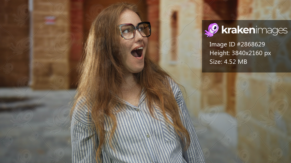 Woman in eyeglasses open mouth on old town street by ancient stone walls under warm sunlight; surprise joy unexpected moment.