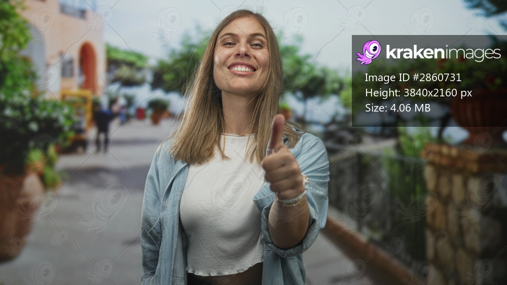 Woman in faded denim shirt gives thumbs up and smiles brightly on sunlit street lined with lush potted plants; approval support optimism.
