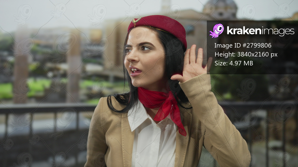 Woman in flight attendant uniform stands in front of roman ruins on street, showing gestures, capturing an outdoor scene.