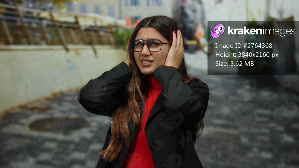 Woman in frustration covering ears on a city street wearing glasses and black jacket outdoors during daytime.