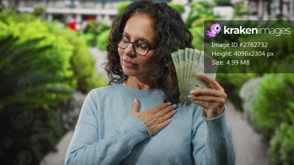 Woman in garden holds argentine pesos to chest, symbolizing pride and prosperity outdoors.