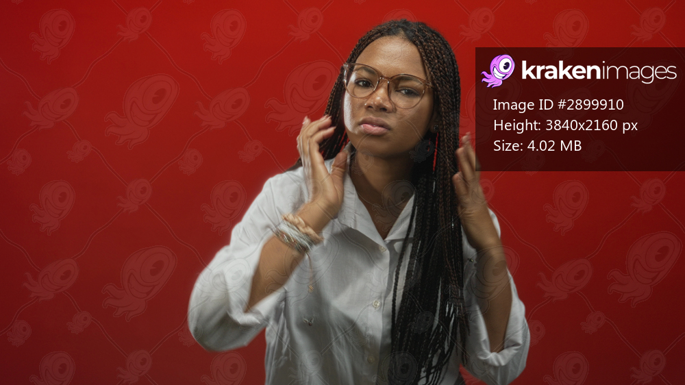 Woman in glasses adjusting long braided hair and touching her face in a red studio wearing a white shirt; concentration.
