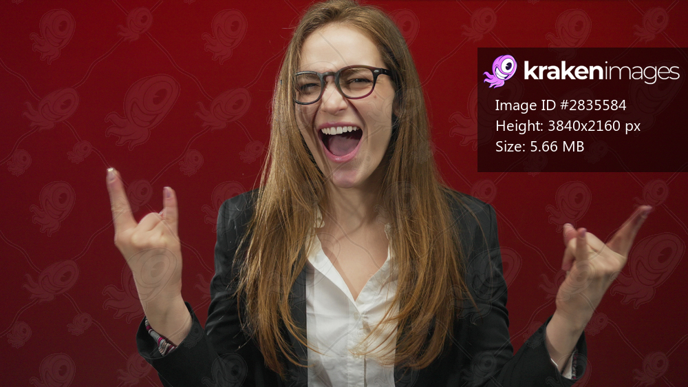 Woman in glasses and black blazer holds rock horns gesture in studio setting with red wall; rock fun metal.