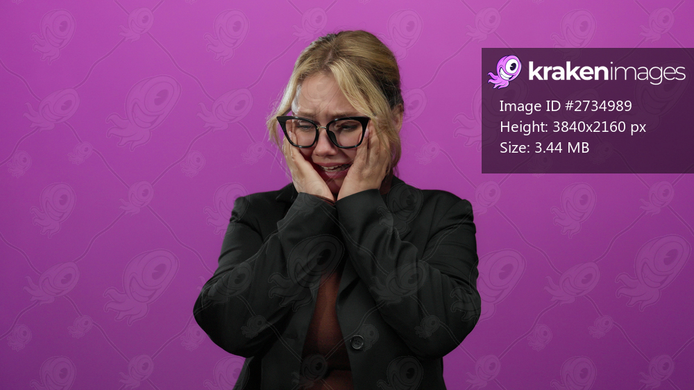 Woman in glasses and black blazer over isolated pink background appears stressed with hands on face, conveying emotion, uncertainty, and worry.