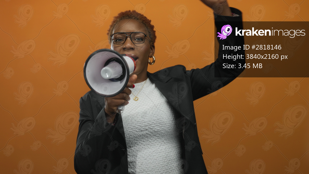 Woman in glasses and blazer raises fist and holds megaphone to mouth in modern orange studio setting; empowerment.