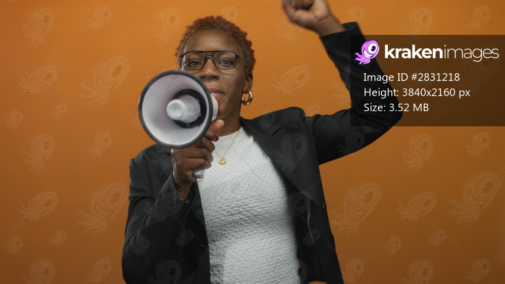 Woman in glasses and blazer raises fist and holds megaphone to mouth in modern orange studio setting; empowerment.