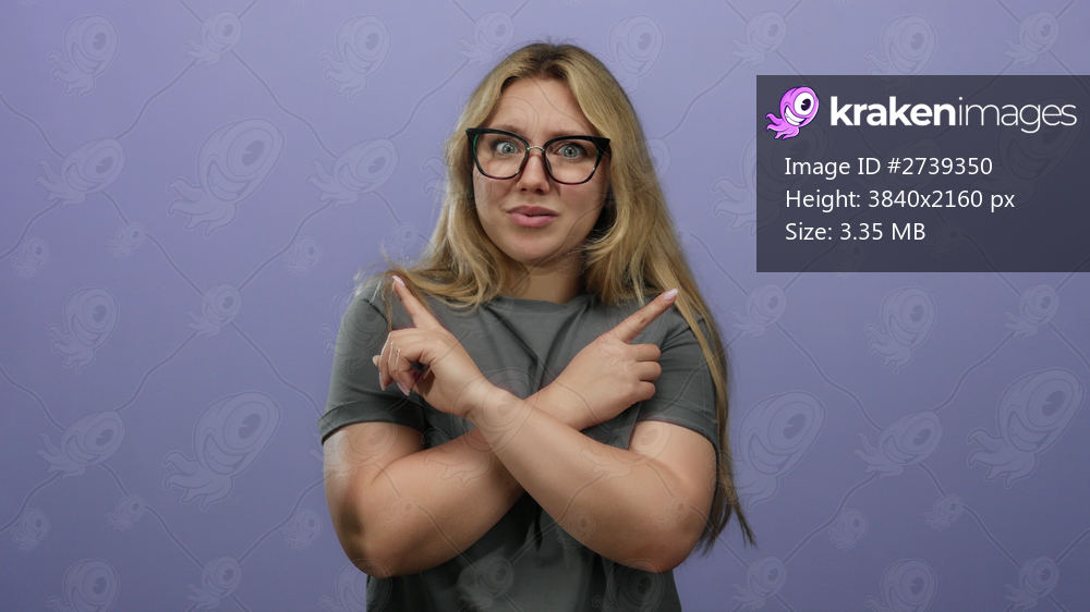 Woman in glasses with blonde hair standing against an isolated purple background crossing arms and pointing in different directions with a curious expression. - Kraken Images