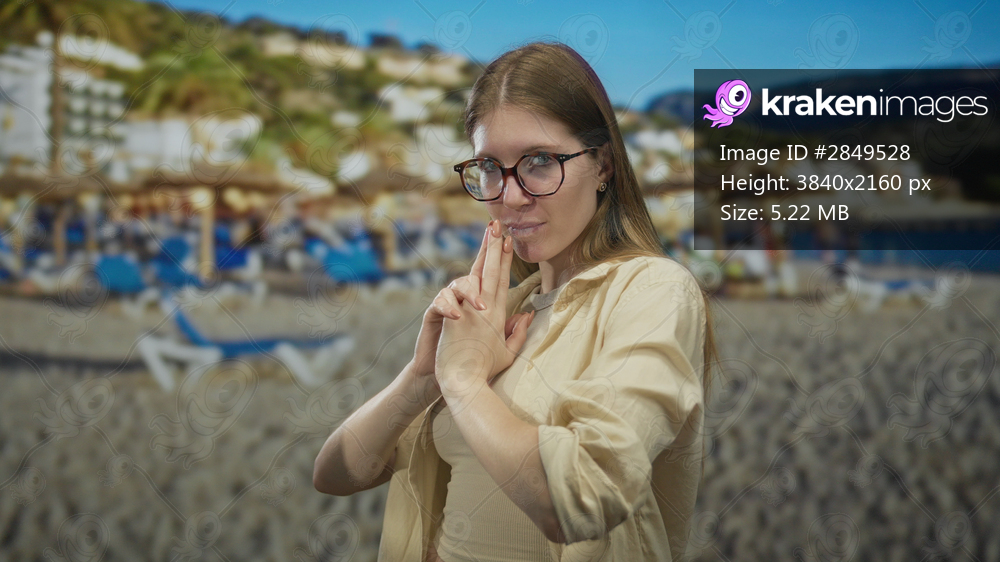 Woman in glasses forms a finger pistol with her hands while standing on a sandy beach by the seaside; playful confidence.
