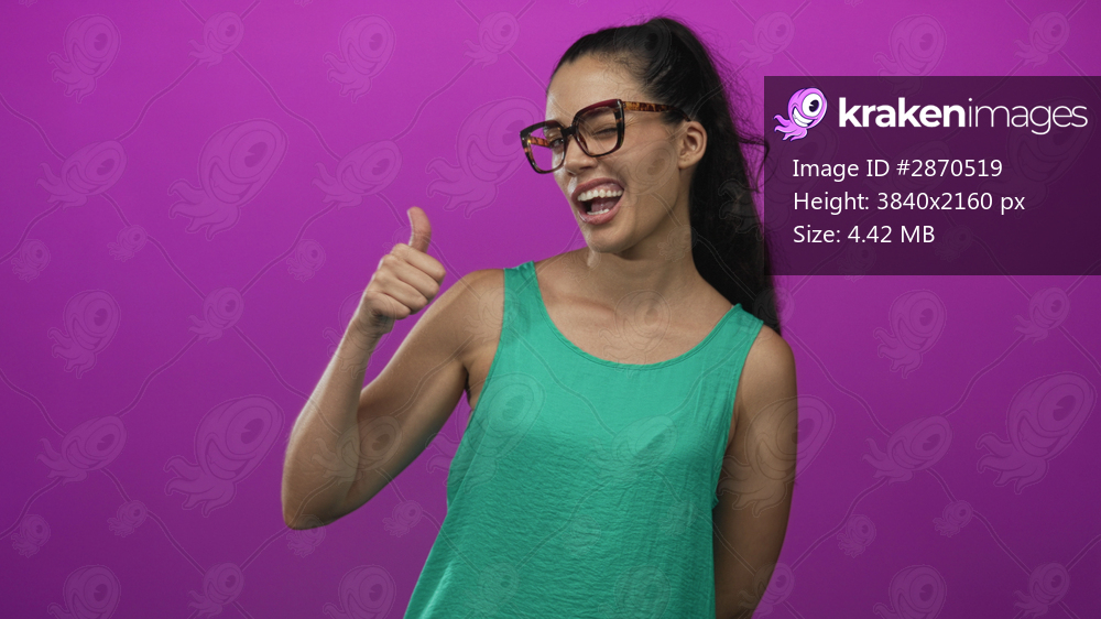 Woman in glasses and green top with expressive grin winks and smiles towards camera in purple studio; playfulness.