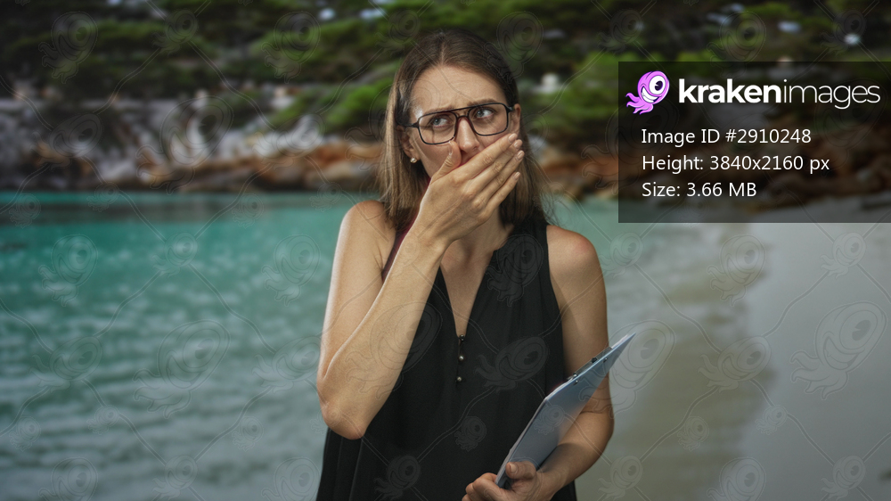 Woman in glasses holding a clipboard covers her mouth with hand on a studio set with turquoise sea and sand backdrop, showing distress; shock response. - Kraken Images